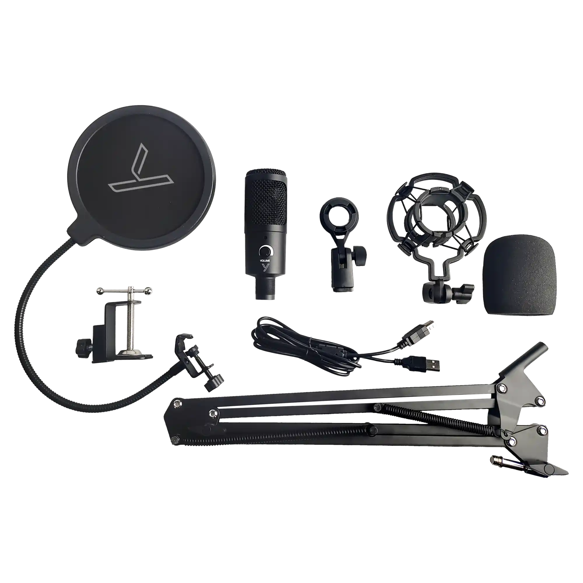 Set uključuje pop filter, antivibracioni držač, vetrobran, podesivi studijski stalak i USB-B na USB-A kabl.